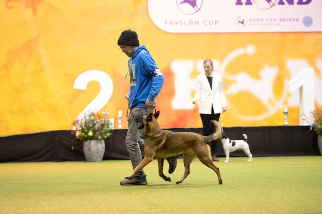 3.5 years old, complete scissors bite, very nice typical male with excellent coat colour and excellent charbonage, excellent head with excellent mask, flat cheeks, excellent dark almond shaped eyes, excellent ears well set on and carried, well chiselled and good pigment, excellent neck, withers, croup and topline, medium angulation front and rear, excellent bone, excellent chest and forechest, well set on tail and correct length, open elbows and paddles when moving, tail carried a little high, good exercise front and rear, very nice friendly temperament, excellently presented.
