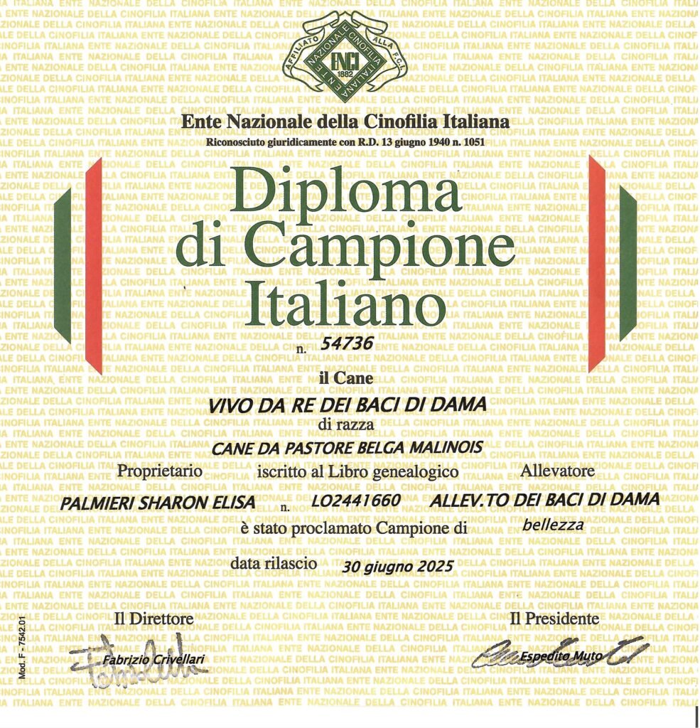 E’ arrivato il Diploma di omologazione del Titolo di Campione Italiano di Bellezza di